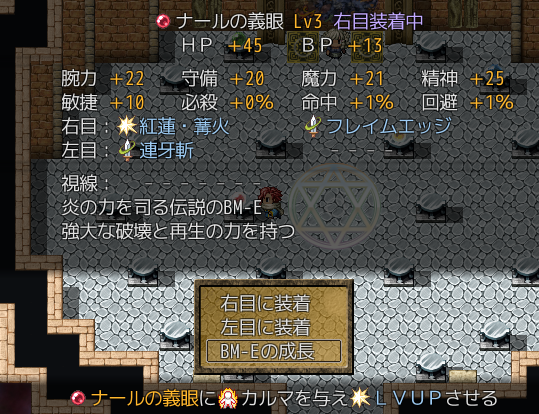 古代の遺跡から発掘された義眼BM-Eは 主人公であるアダラトの目に付けることで 様々な強さを引き出します 一つのBM-Eでも右目に付けたときと左目に付けたときでは 引き出せる能力が異なり強敵との戦闘では戦略の肝となります |