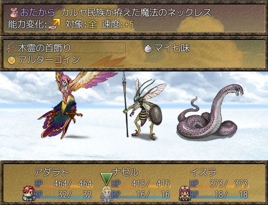 冒険の途中で手に入れ身に着けたおたから 戦闘中に効果のあるものを使い有利に進めることもできます ただし、1回の戦闘で1種類1度しか使えないので 何をどのタイミングで使うのかも大事です 戦闘が終われば次の戦闘でまた使用することができます 一発逆転の必勝おたからを探すのも楽しいかも |